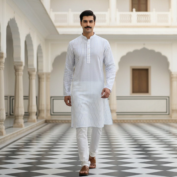 White Kurta Pajama with Blue Stripes – Elegant Traditional Outfit for Men