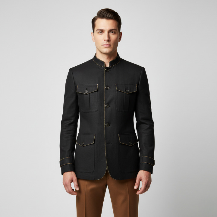Make a bold style statement with this black safari bushcoat for men, featuring refined contrast stitching and a sleek mandarin collar. Designed with four flap pockets and a structured silhouette, this tailored bushcoat combines modern sophistication with timeless charm. Ideal for formal occasions, business events, or elevated everyday wear