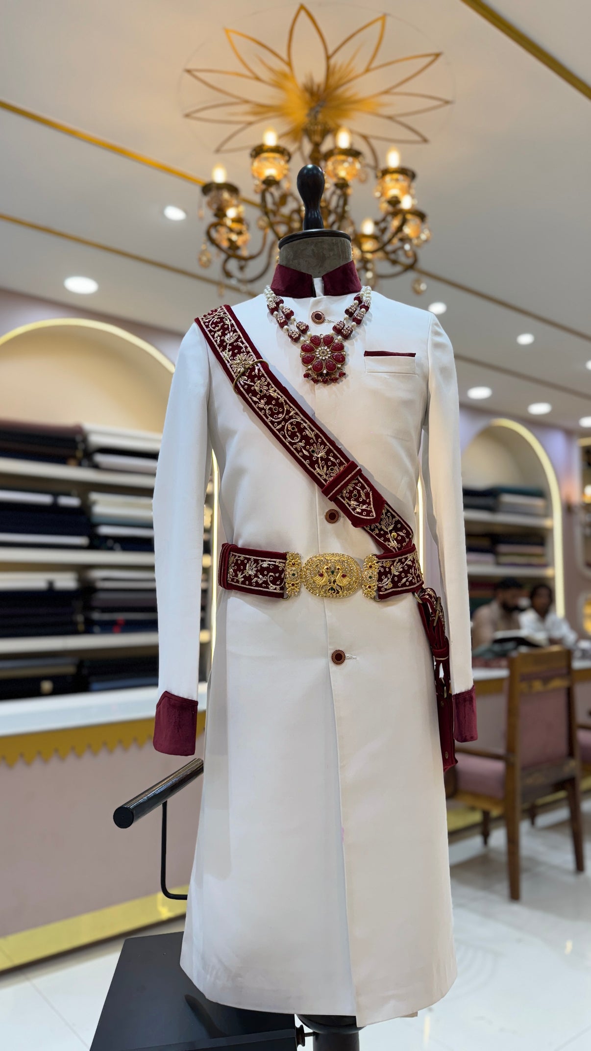 Classic White Sherwani with Maroon Velvet Detailing & Royal Embroidered Belt | Luxury Groom Outfit