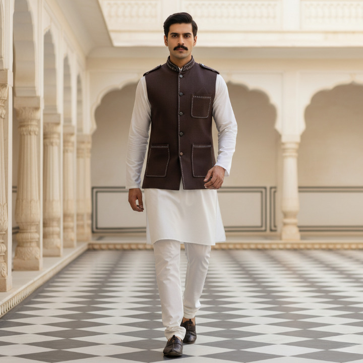 Elevate your ethnic wardrobe with this deep brown designer hunting jacket, crafted with fine contrast stitching and stylish flap pockets. Perfect for festive events, weddings, and royal gatherings, this jacket combines traditional charm with a modern tailored fit for a refined and distinguished look.