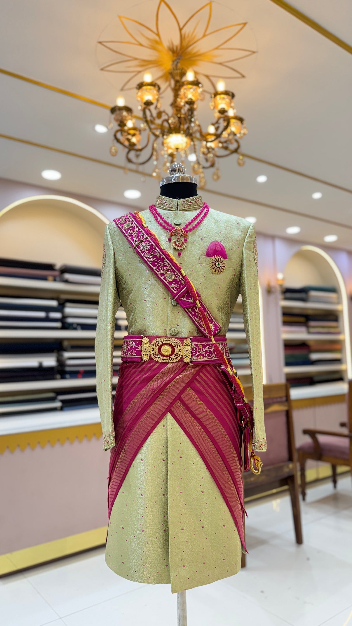 Step into royalty with this light green sherwani adorned with intricate embroidery and a rich pink stole. Featuring detailed embellishments, a designer belt, and luxurious jewelry accents, this outfit perfectly balances tradition and modern elegance. Ideal for grooms and grand festive occasions, this royal sherwani is crafted to make you stand out with sophistication and style.