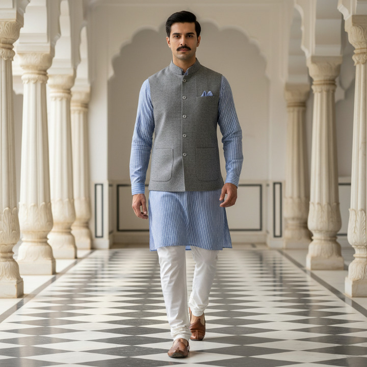 Elevate your ethnic style with this sophisticated grey semi hunting jacket. Featuring fine fabric texture, a mandarin collar, and minimalist design, it pairs perfectly with kurtas for weddings, festive gatherings, and formal celebrations.