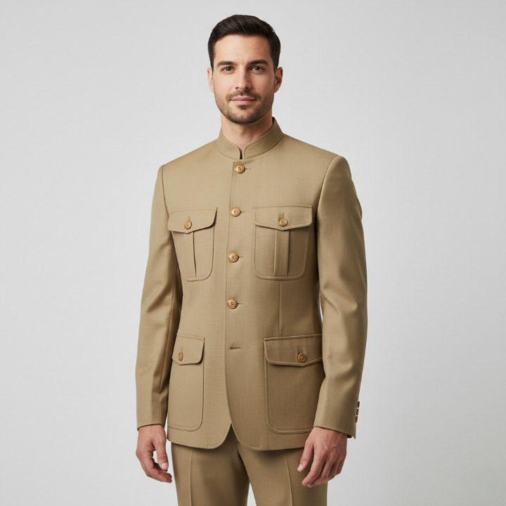 Classic Khaki Bushcoat for Men – Safari-Inspired Mandarin Collar Jacket | Premium Formal & Outdoor Wear
