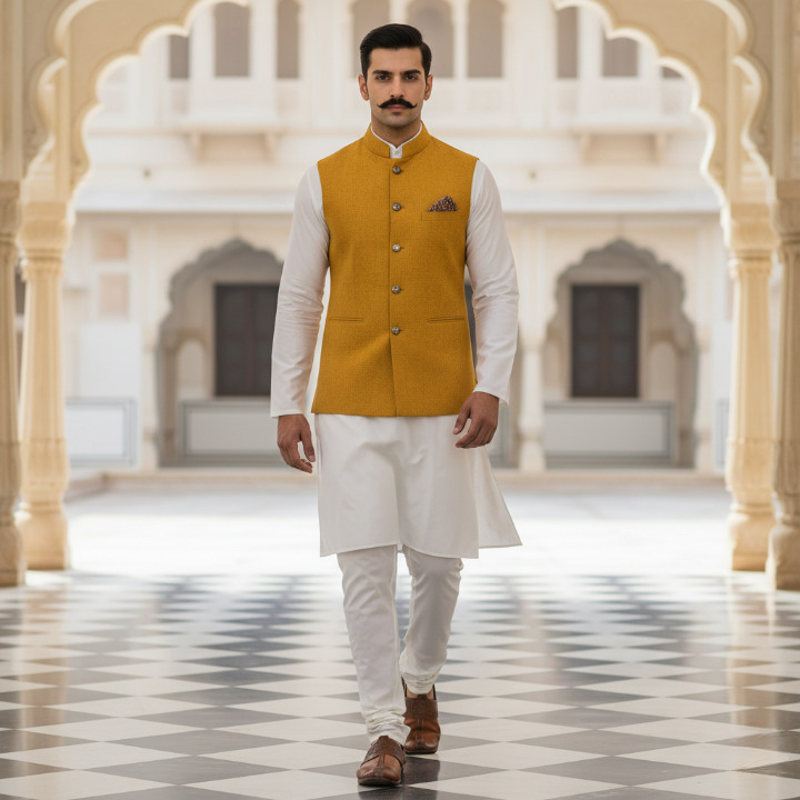 Add a bold yet elegant touch to your ethnic wardrobe with this mustard yellow semi hunting jacket for men. Featuring a mandarin collar and premium fabric finish, it pairs perfectly with kurtas or sherwanis for weddings, festive occasions, or formal gatherings. Designed for comfort, style, and sophistication.