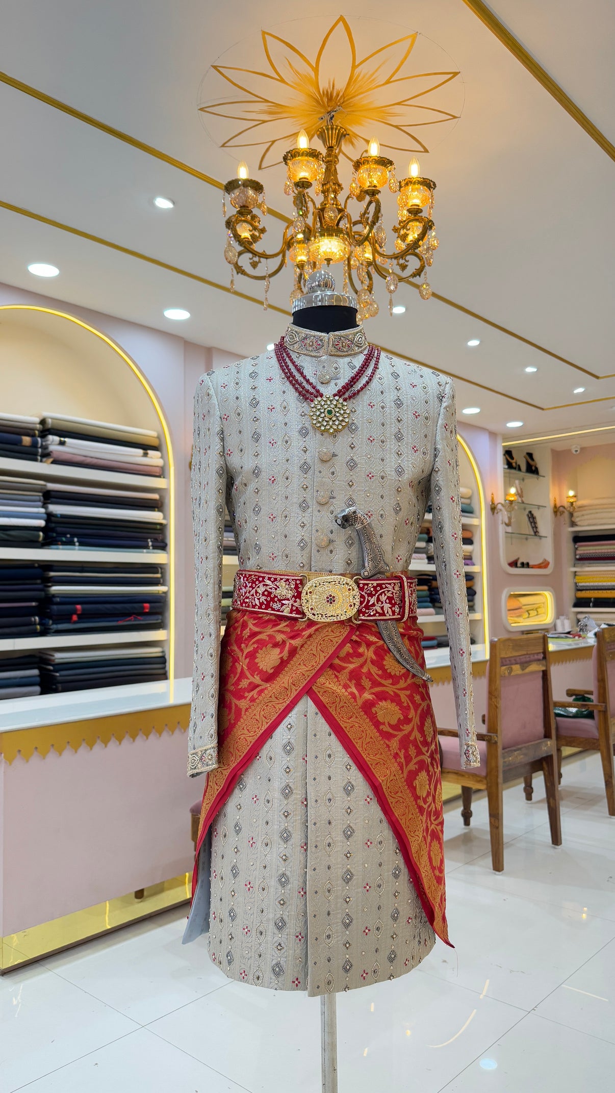 Royal Ivory Sherwani with Red Kamarbandh and Embellished Details | Wedding Groom Outfit