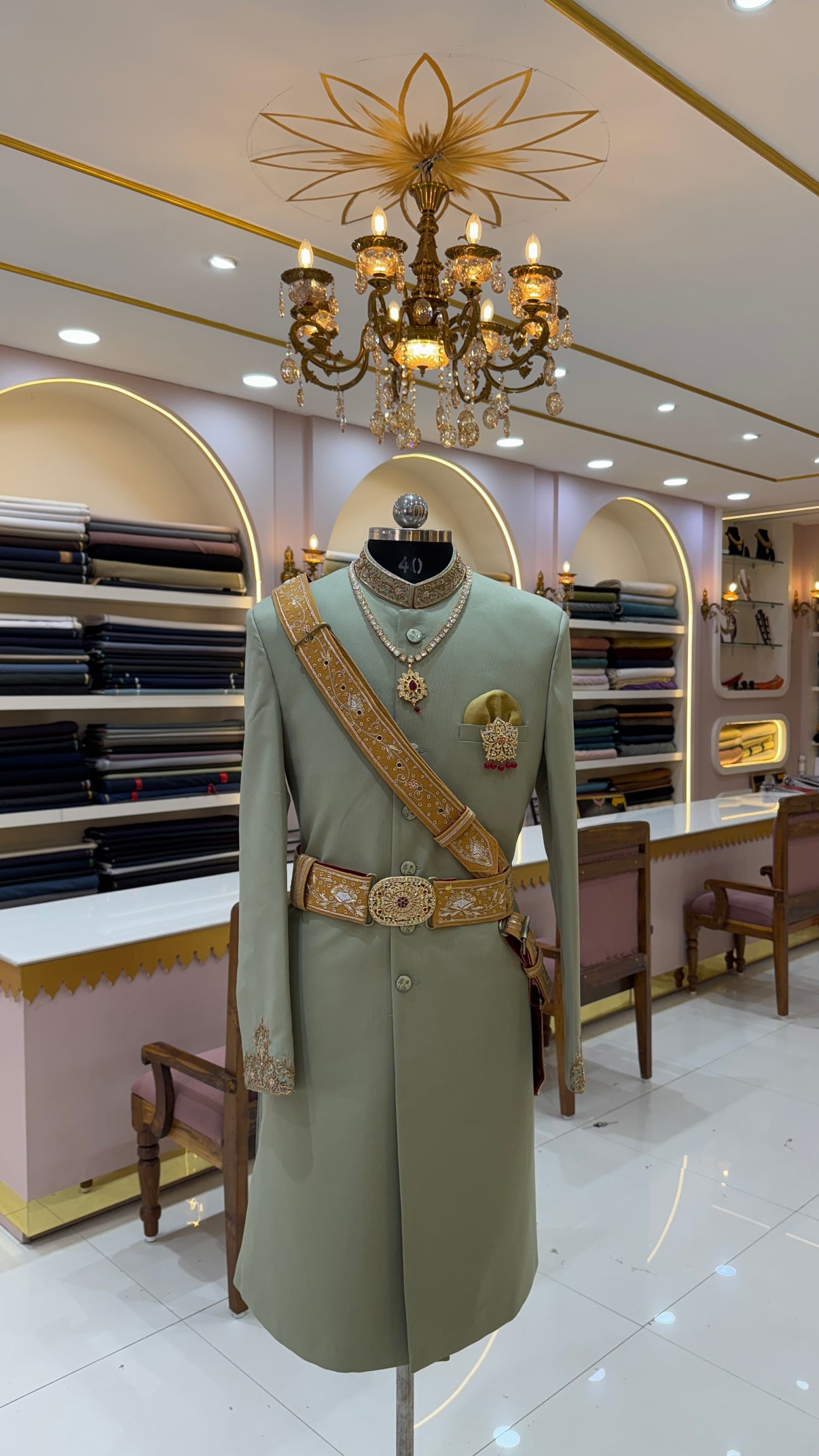 Sage Green Royal Sherwani with Golden Embroidery & Handcrafted Belt | Designer Groom Outfit